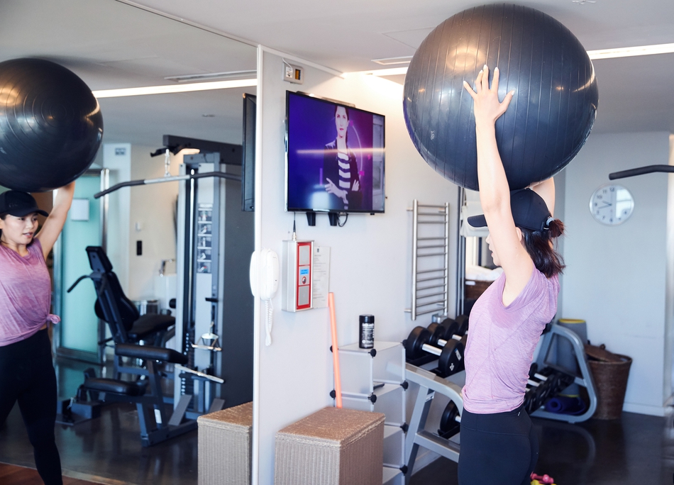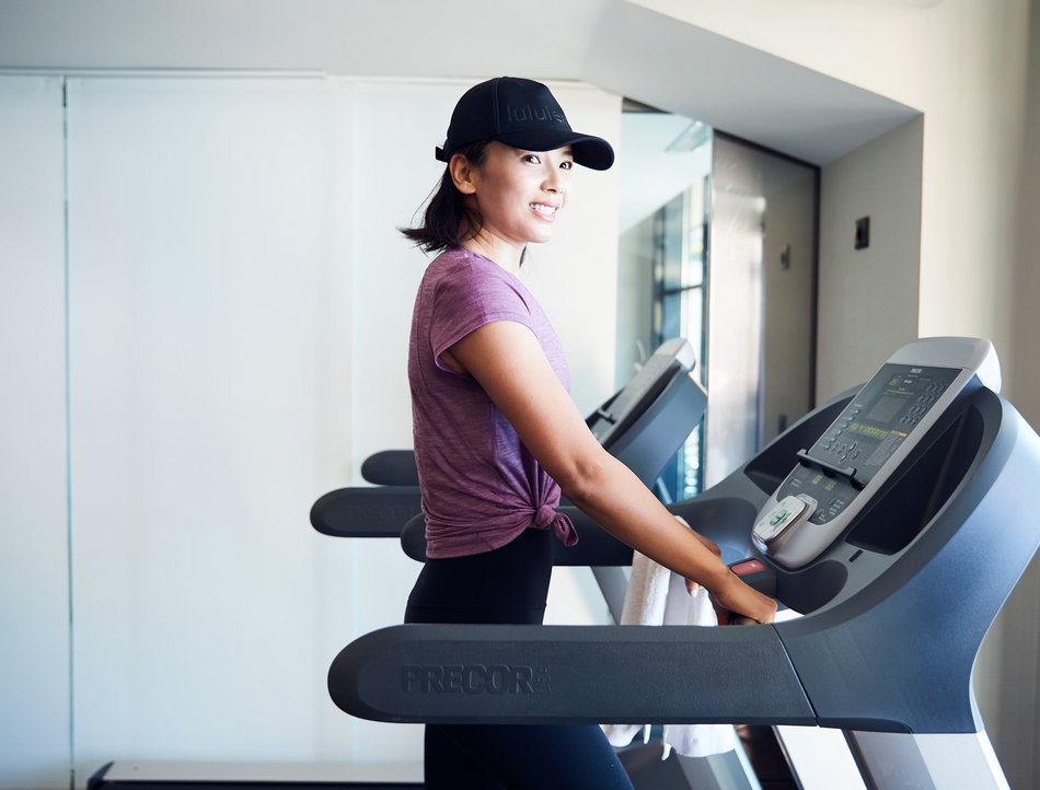 1/23早上9:00,我们和刘涛相约在酒店的健身房。紫色t恤、黑色紧身裤配黑色棒球帽、素颜的刘涛已经开始跑步。