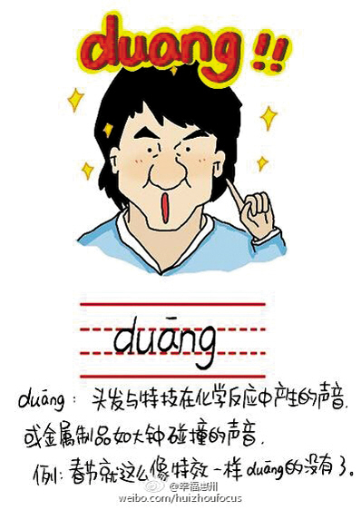 当然,这纯属恶搞,“Duang”字在任何一本汉语字典上都是不存在的!它只是一个用于口头表达的非规范拟声词。比如有网友具体描述:“瘦子摔倒的声音:Pia!胖子摔倒的声音:Duang!”又比如网友造句:“从前有个男孩叫司马光,有一天他开心地砸了一个缸,Duang!”