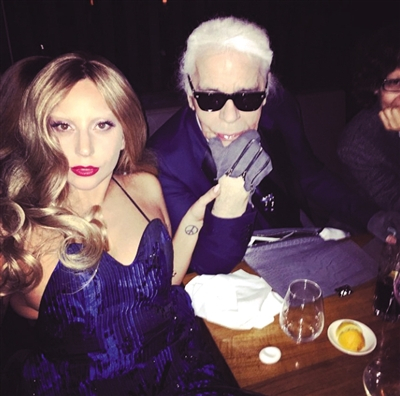 与Gaga关系不错的卡尔·拉格斐(小图)、莫尼克·鲁里耶、阿尔伯特·蒂尔菲、唐娜·凯伦、黛安·冯芙丝汀宝等近40位一流大牌的掌门人向Gaga伸出橄榄枝,搞得天后一度陷入选择障碍。虽然在这场“婚纱设计争夺战”中,Gaga最终钦点了婚纱女王Vera Wang负责操刀,然而各路品牌设计师仍不自觉的,愿意为这个百变天后画上几笔。日前,《WWD》邀请Chanel、Lanvin、Balenciaga等33个品牌设计师为gaga贡献了婚纱草图。能够引时尚英雄竞折腰的,大抵只有Gaga了。