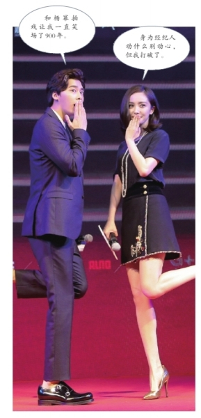 京华时报讯(记者高宇飞)7月16日,由陈国辉执导,杨幂、李易峰领衔主演,张云龙、迪丽热巴等主演的爱情电影《怦然星动》在上海举行发布会,宣布定档12月3日。现场李易峰提臀捂嘴,搞怪模仿杨幂。片中杨幂饰演金牌经纪人田心,与李易峰饰演的当红艺人苏星宇上演一段“禁忌之恋”。她说,自己这次成功逆袭,由《古剑奇谭》中倒追李易峰变为被追,“终于报复了一把”。发布会现场延续了片中的人物设定,杨幂作为金牌经纪人分别考验李易峰、张云龙与迪丽热巴的才艺。热巴诠释多国语言,张云龙弹唱原创歌曲,李易峰则搞怪上演超级模仿秀之“杨幂篇”,集中模仿了她在机场走丢的呆萌、进酒店时碰到玻璃旋转门的窘迫,以及经典广告中提臀捂嘴的俏皮。