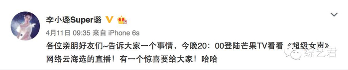 而在节目开始前,李小璐也亲自发微博为妹妹加油助威