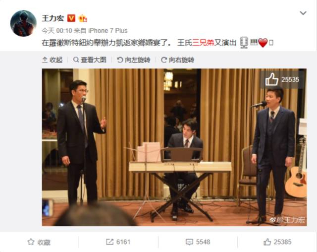 上一年弟弟王立凯结婚,第一次当婚礼演唱嘉宾的王力宏兴奋了很久。晒出了一张与哥哥献唱的照片:“跟哥哥王力德昨晚的二重唱”。我们是最骄傲的婚礼歌手,祝弟弟王力凯白头偕老,永浴爱河!”