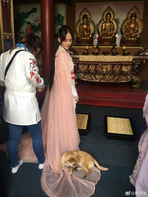 5月24日,陈乔恩在微博上晒出了自己在剧组和一只狗狗的合影,并称狗狗的名字叫小暴牙是个跟屁虫;同时新剧造型曝光仙气足,现场>>
