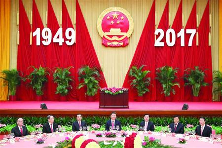 人民大会堂宴会厅华灯璀璨,宾朋济济一堂,气氛喜庆热烈。主席台上方庄严的国徽高悬,在鲜艳的红旗映衬下,“1949-2017”的大字年号熠熠生辉。