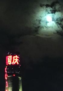 记者于昨晚19点30分在陆家嘴环形天桥上拍摄到中秋明月,上海中心顶楼刚好显示出“国庆”二字。/晨报记者 谢竲