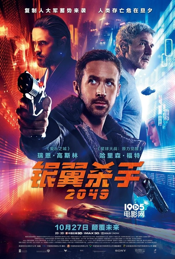 《银翼杀手2049》由美国索尼哥伦比亚电影公司出品,前作导演、曾执导《火星救援》《异形:契约》的“科幻片教父”雷德利·斯科特担任制片人,《降临》《边境杀手》导演丹尼斯·维伦纽瓦执导,传奇摄影大师罗杰·迪金斯掌镜,瑞恩·高斯林饰演新一代银翼杀手K,哈里森·福特继续出演前任银翼杀手瑞克·戴克、安娜·德·阿玛斯饰演AI女友乔伊、杰瑞德·莱托饰演反派华莱士、西尔维娅·侯克斯饰演华莱士的心腹露芙、罗宾·怀特饰演K的上司、戴夫·巴蒂斯塔饰演复制人萨珀,阵容堪称顶配。影片讲述了在人类与复制人共生的2049年,两个种族之间的矛盾已上升到不可调和的地位,对决一触即发,人类存亡危在旦夕!10月27日起,影片正以2D/3D/IMAX 3D/中国巨幕3D等全制式在中国内地全面上映。