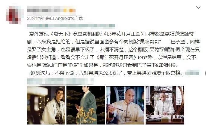 竟然有网友借此联想到了《赢天下》是秦朝版《那年花开月正圆》,据说里面也会有个秦朝版“吴聘哥哥”——巴子墨,同样是娶了女主角,也是很早下线了,同样是寡妇逆袭题材,谁能更胜一筹呢?