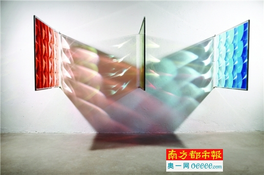 现场欣赏曾曦的作品,令人有奇妙之感。光亮如镜的不锈钢上的环氧树脂色斑,透明有机玻璃里看似正在下落的“水滴”,数十个集中的不锈钢半球体像是昆虫的“复眼”……而观众本身的形影映射在光洁的材质上,与“作品”相应成趣、浑然一体。策展人杨小彦教授说,“传统艺术的概念总是围绕点线面、语言、色层,总是在思考如何把对象描绘得更写实或更抽象,曾曦的创作则把艺术的问题变成探讨视觉观看可能性的问题”。