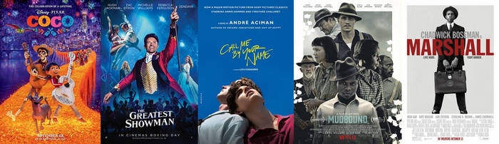 其中,Keala Settle将献唱《马戏之王》主题曲《This Is Me》,Sufjan Stevens将献唱《请以你的名字呼唤我》主题曲《Mystery of Love》,Mary J. Blige将献唱《泥土之界》主题曲《Mighty River》,Gael García Bernal将联手Natalia LaFourcade和Miguel献唱《寻梦环游记》主题曲Remember Me,Andra Day与Common将献唱《马歇尔》主题曲《Stand Up For Something》。