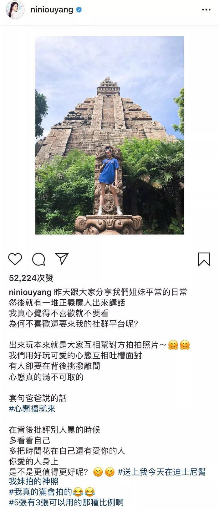 在Instagram上,欧阳妮妮的照片配文也被指“阴阳怪气”。