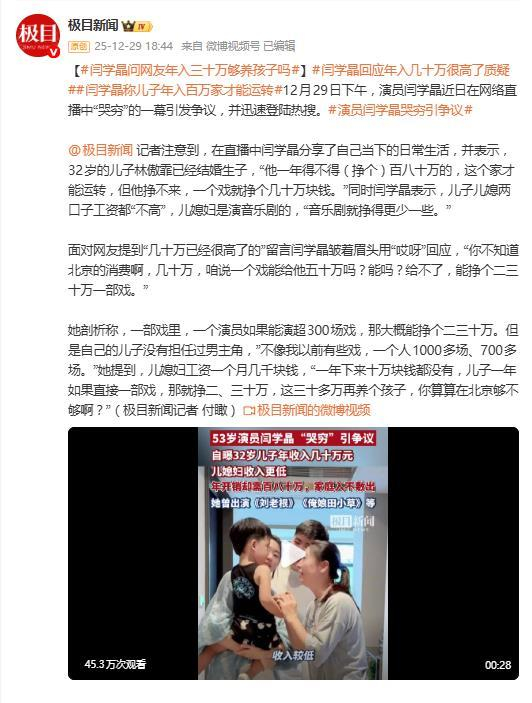 演员闫学晶回应网友“年入几十万很高了”:你不知道北京的消费啊