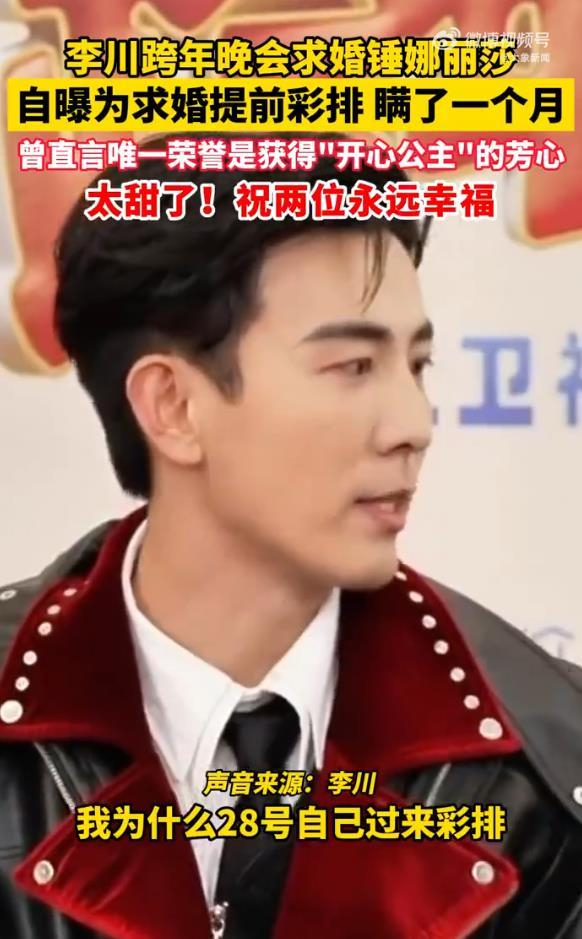 演员李川在浙江卫视跨年晚会后台首次披露:为向女友锤娜丽莎求婚,他提前彩排,将计划捂得严严实实,瞒了整整一个月。这番告白让身旁的锤娜丽莎当场愣住,随即犀利吐槽:“你彩这个了?看起来很没有必要。”——显然,她对这场“预谋”毫不知情。他曾坦言:“做演员7年了,除了赢得“开心公主”的芳心,没有获得任何的荣誉。”