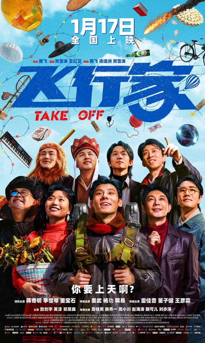 由鹏飞执导,双雪涛、王红卫监制的电影《飞行家》今日发布“我要上天”版预告及“全员起飞”版海报,并官宣全阵容。影片由蒋奇明、李雪琴、董宝石领衔主演,姜武、杨玏、蒋易特别出演,雷佳音、董子健、王彦霖特邀出演。电影讲述了沉迷飞行的东北犟种李明奇(蒋奇明 饰)在妻子高雅风(李雪琴 饰)的支持下,用被嘲笑了半辈子的飞行梦对抗命运并勇敢反击的故事。预告中,李明奇来到高雅风家“见家长”,不聊婚事聊理想。他的一系列奇葩发言听得小舅子高旭光(董宝石 饰)直呼奇怪,甚至老丈人高立宽(姜武 饰)也惊讶于他的想法,“往上飞”在李明奇心中的重要性可见一斑。而在今日同步发出的海报中,众人神色各异地看向天空,空中点缀着五花八门的道具,也为画面注入了憧憬和趣味。目前影片已官宣1月17日全国上映,将为观众带来兼具热血浪漫和笑泪温情的冒险。