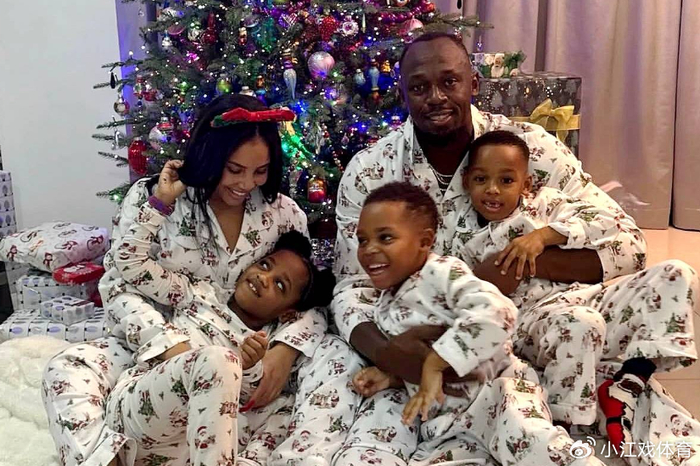 在博尔特晒出的全家福上,他们一家人穿着同款的睡衣。其中一张照片上,博尔特夫妻二人站在后排,三个孩子站在前排。在博尔特的身前是自己的大女儿以及一个儿子。另外一个儿子在妻子的身前。