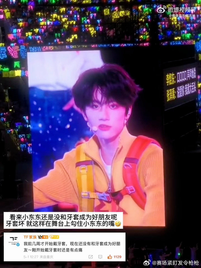 555李煜东你怎么这么可爱啊!李煜东在台上唱歌时突然被牙套“偷袭”了一下,但作为一个超级敬业的偶像,还是坚持着把舞台完成了!戴牙套的适应期确实很不容易,但是李煜东还是努力把每个舞台都做好,看着弟弟一步一个脚印的努力成长着,真的很感动了~ (@LiveMusic速递)