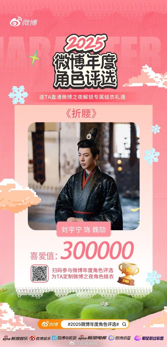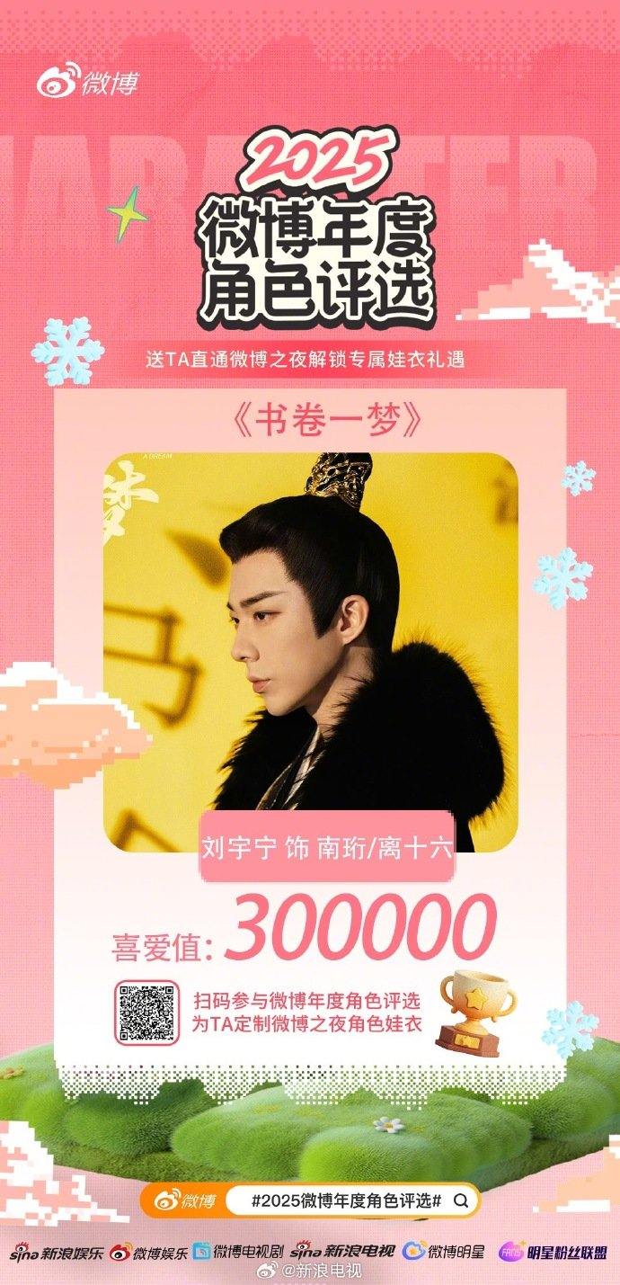 【#刘宇宁三角色喜爱值破30万#】据@新浪电视 :刘宇宁@摩登兄弟刘宇宁 饰演的南珩、离十六、魏劭,三角色在“2025微博年度角色评选”喜爱值强势冲破30万。从温润公子到江湖游侠,再到权谋强者,多元人设被完美驾驭,演技与人气双认证!