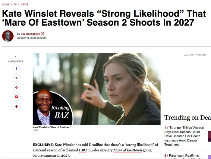 #TNABO# 凯特·温斯莱特:《东城梦魇》第二季大概率将于2027年开机