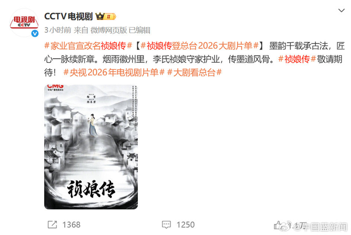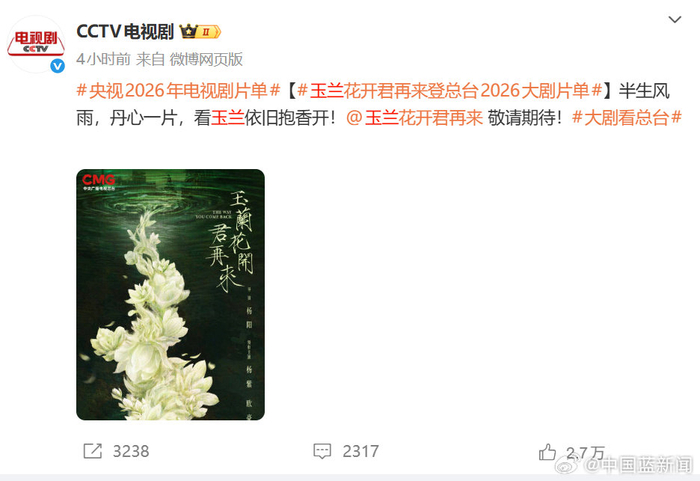 杨紫三部剧入选央视2026年片单 中国蓝新闻 浙江广电集团融媒体新闻中心中国蓝新闻官方账号 01.0914:33 关注 【#杨紫2026年3部剧央视待播#】1月9日,CCTV电视剧发布2026年电视剧片单,由@杨紫 主演的《生命树》、《祯娘传》、《玉兰花开君再来》均登上总台2026大剧片单,一整个期待了!#杨紫祯娘传新镜头#