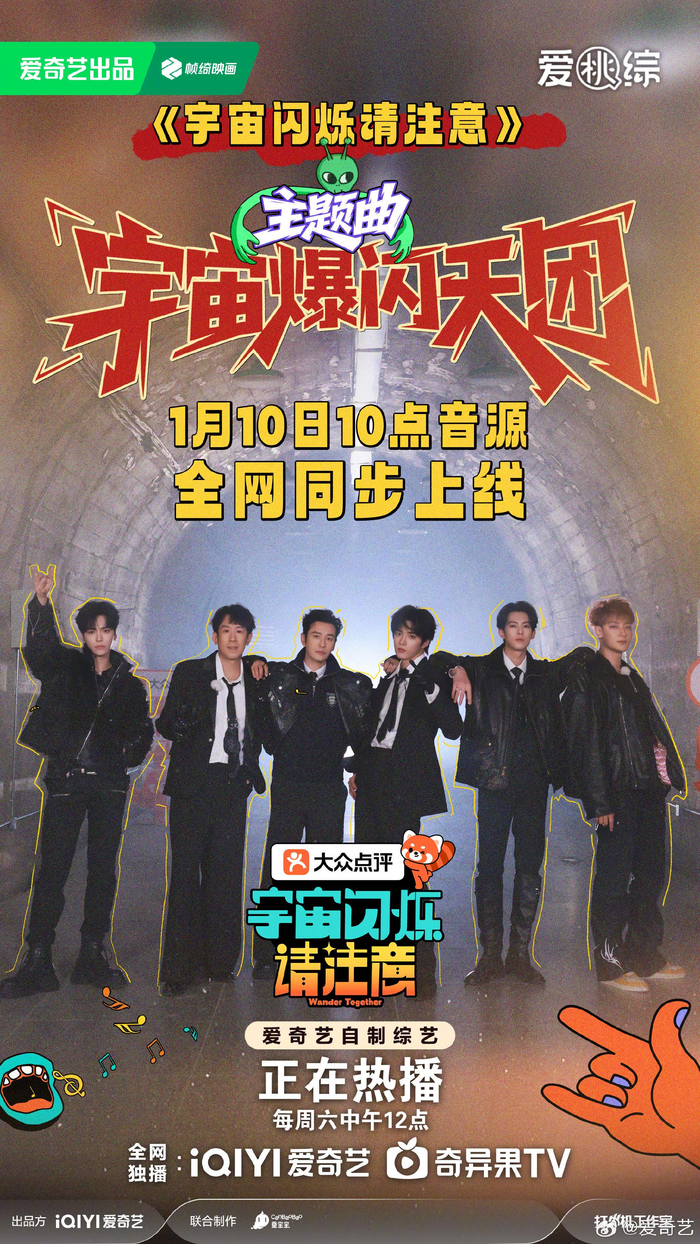 #宇宙闪烁请注意主题曲# 速报!#宇宙闪烁请注意# 主题曲《宇宙爆闪天团》来了!由宇宙爆闪团@黄晓明 @ACE-YOUNGKINGYOUNGBOSS @时代少年团-刘耀文 @POLARIX-邵子恒 @王鹤棣_Dylan @于洋_脸脸 (按姓名首字母排序)共同演唱,明天上午10点音源全网同步上线!准备好让这首歌住进你的脑内循环了吗?