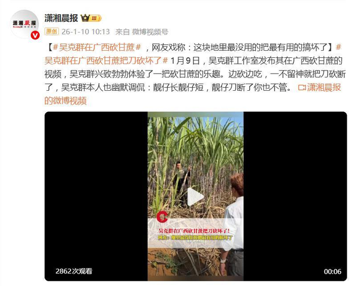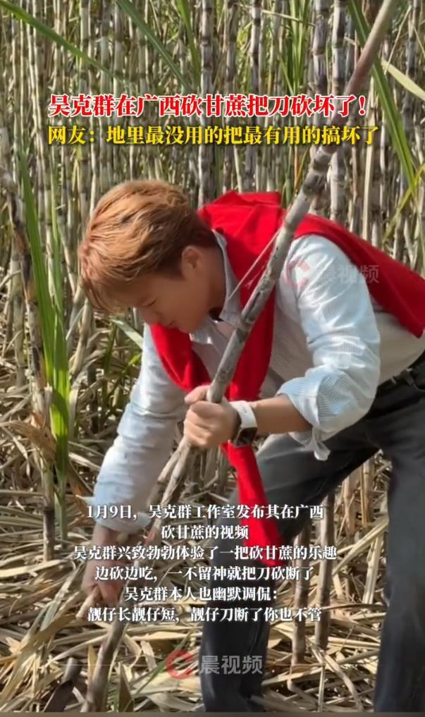 2026年1月9日,吴克群工作室发布了一段他在广西百色体验农活的视频。画面里,他兴致勃勃地挥舞镰刀砍向甘蔗,边砍还边尝两口,结果因用力过猛,镰刀当场“罢工”断裂。面对这狼狈又滑稽的一幕,吴克群本人倒是相当豁达,幽默自嘲道:“靓仔长靓仔短,靓仔刀断了你也不管。”