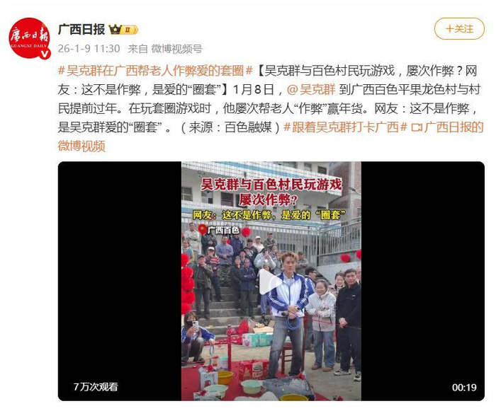 完成“剪橘KPI”后,吴克群又转战平果的甘蔗田,继续解锁新农活。从坐拖拉机、穿拖鞋下地(被戏称掌握了广西人精髓),到砍甘蔗时主动向农民请教技巧,失败后憨笑自嘲,全程毫无明星架子,完全融入了当地氛围。不仅如此,他还配合网友提议,体验了套圈送年货、逛夜市等活动,被总结为“活越接越多”。这份真诚又接地气的表现,也获得了广西文旅厅的多次点赞。