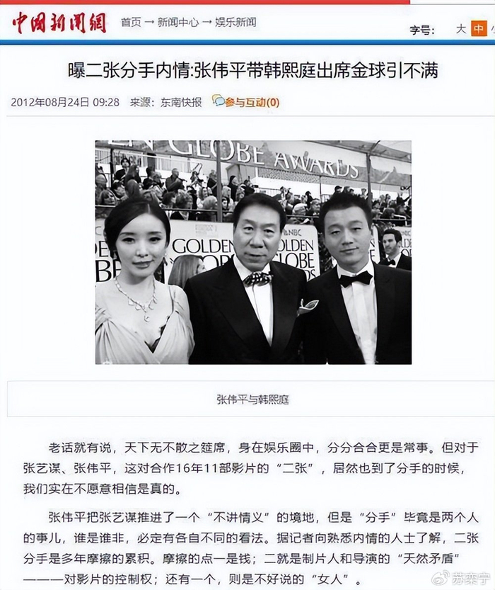 虽然韩熙庭火了,但是张艺谋和张伟平两人的合作却走向了分裂。