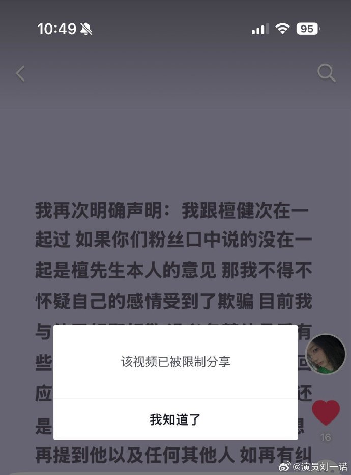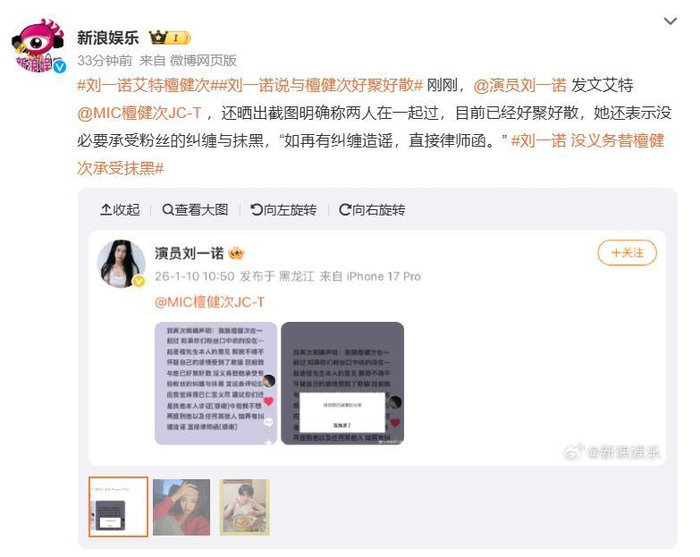 事件导火索在1月7日被点燃。檀健次发布一则“三只单身狗”视频,疑似否认当前恋情状态。仅39分钟后,刘一诺迅速发文回应,承认两人“在一起过已分手”,并解释自己最初发布相关内容的初衷仅是记录生活,不愿被外界误认为是其他爆料女性。三天后的1月10日,她的表态更为直接锋利:若粉丝坚称“从未交往”是檀健次本人意见,则她将质疑自己在这段感情中是否遭受欺骗。她强调双方已“好聚好散”,自己无义务替对方承受粉丝的抹黑,并划下红线——“再造谣直接发律师函”。支持她的声音认为其态度刚硬,并指出若恋情纯属虚构,檀健次方应直接诉诸法律而非保持沉默。