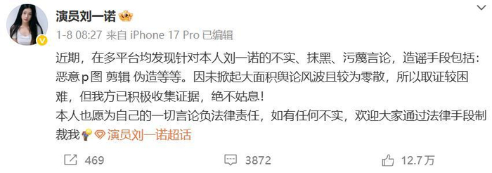 然而,这场个人声明迅速被卷入更庞大的叙事中。知名狗仔刘大锤爆料称,檀健次正遭遇“系统性抹黑”,指出从1月3日的司晓迪到1月7日的刘一诺,连环爆料时间点高度巧合,符合娱乐圈“狙击顶流”的常见套路。1月8日,刘一诺曾发文控诉,称在多个平台均发现针对自己的不实言论,手段包括恶意P图、剪辑、伪造等,并表示已积极收集证据,绝不姑息。她更在文中宣称:“本人愿为自己的一切言论负法律责任。”