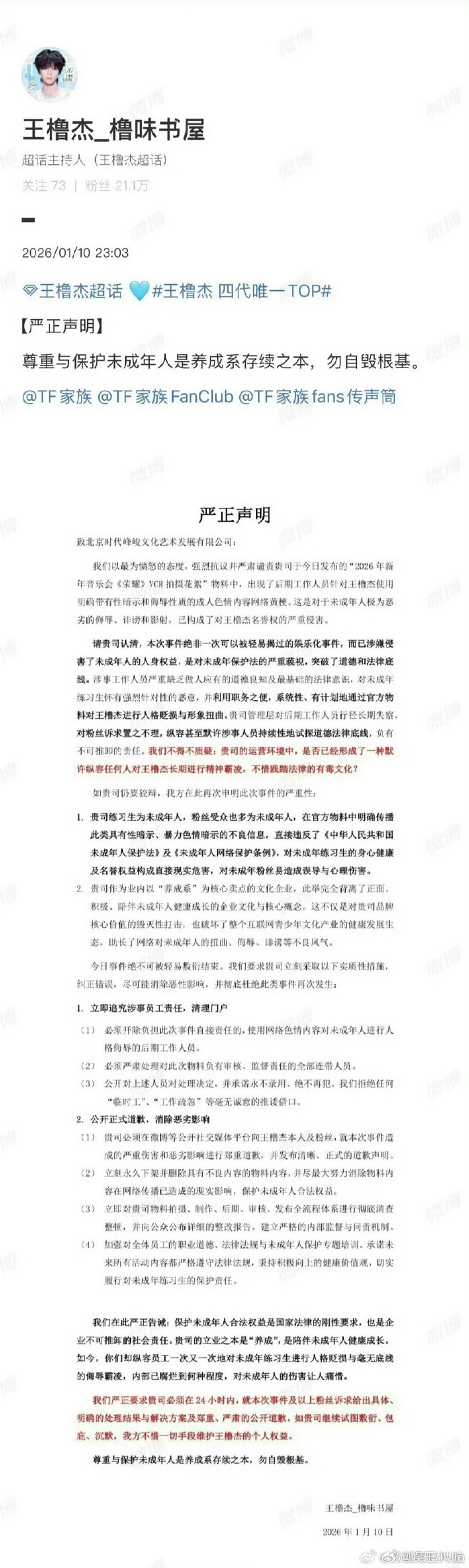 王橹杰粉丝要求公司回应维权诉求