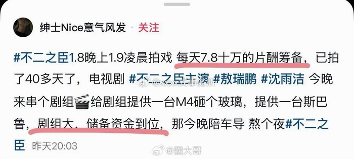 敖瑞鹏新剧不二之臣片酬筹备曝光 圈大哥 01.1115:43 关注 #敖瑞鹏不二之臣片酬筹备#敖瑞鹏的含金量又一次见识到了啊!没想到电视剧《不二之臣》居然这么有实力。网友分享了新剧的片酬筹备,大剧组的排面谁看了不迷糊啊,咱们帅哥也是好起来了啊~#敖瑞鹏不二之臣剧组实力#