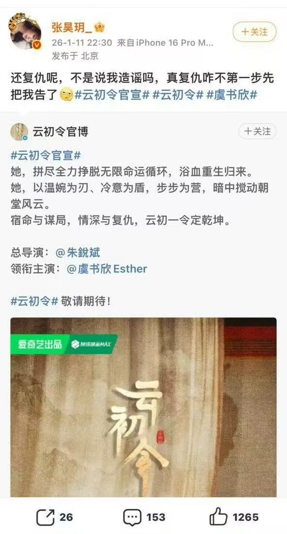 #张昊玥转发云初令官宣博##张昊玥转发云初令# 张昊玥转发云初令官宣博,哈?这是咋了!!!