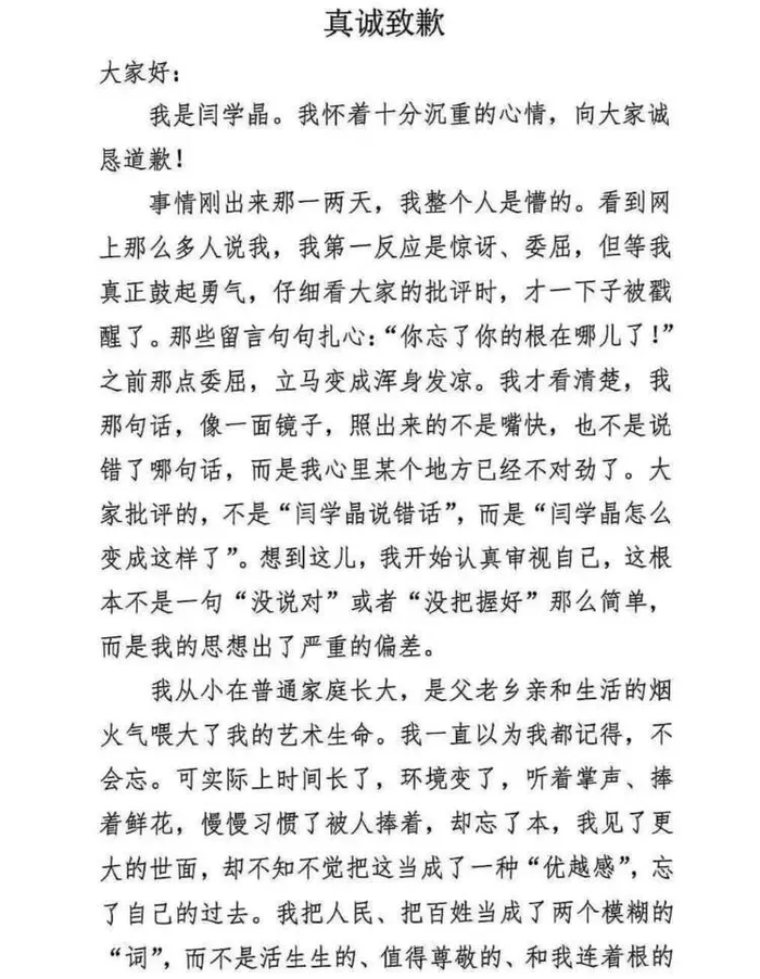 虽然我认为闫学晶的这封道歉信写得很好,但是实际上,这封道歉信,存在一个很致命的问题。