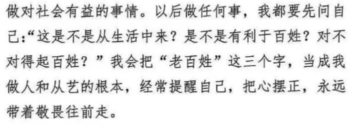 而且她还用排比句强调未来的行为准则,将“百姓”放在了至高无上的位置,回归了“人民艺术家”的初心: