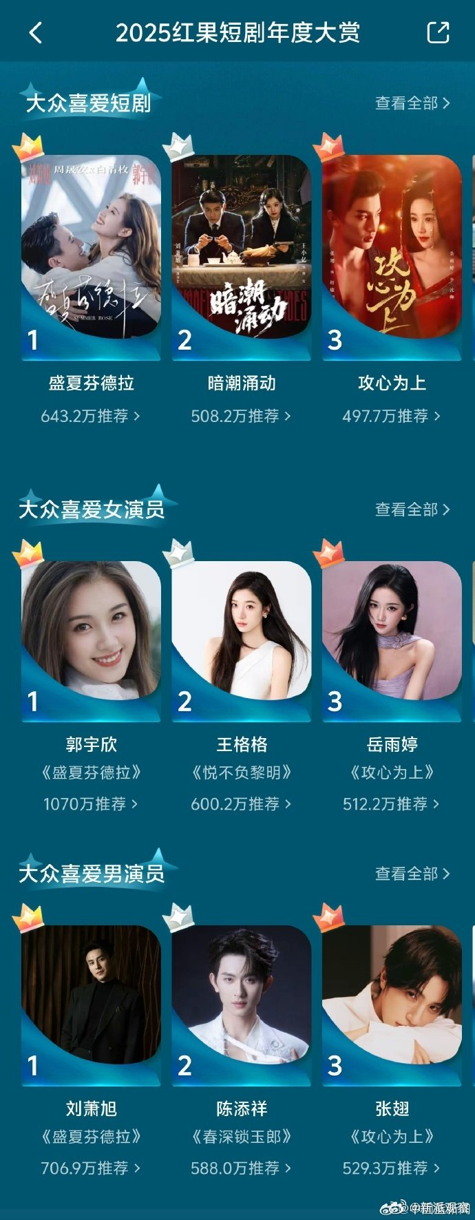 【#刘萧旭郭宇欣登顶红果男女演员榜首#】1月11日,#红果年度大赏# 公布。《盛夏芬德拉》登顶大众喜爱短剧第一名,该剧男女主演刘萧旭@刘萧旭-Mr 和郭宇欣@郭宇欣er ,分别登顶大众喜爱男女演员榜首。祝贺顶峰相见!(中国蓝新闻)
