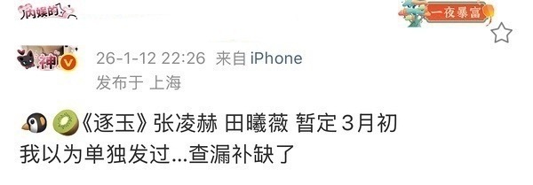 张凌赫田曦薇新剧逐玉暂定3月初开播