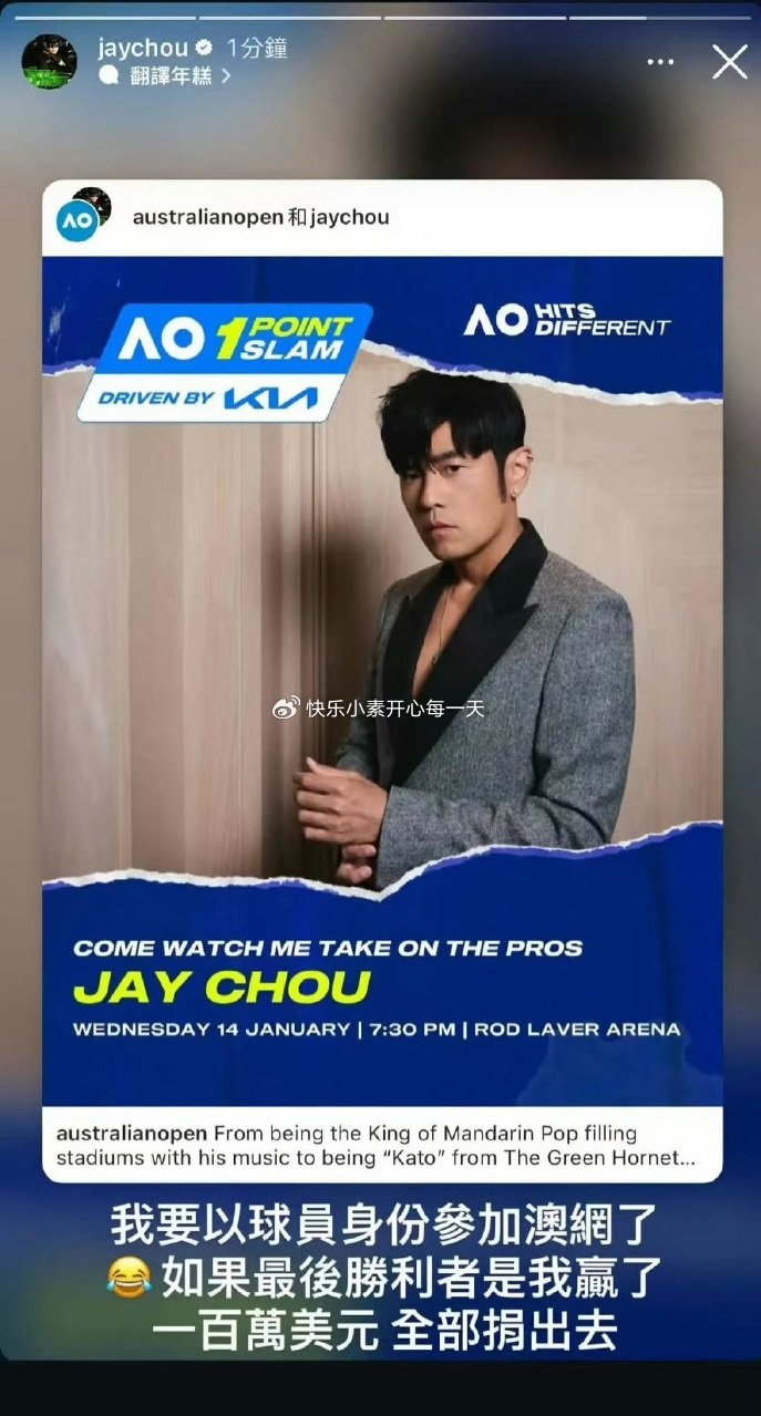周杰伦:我要以球员身份参加澳网了,如果最后胜利者是我,贏了的一百万美元全部捐出去。