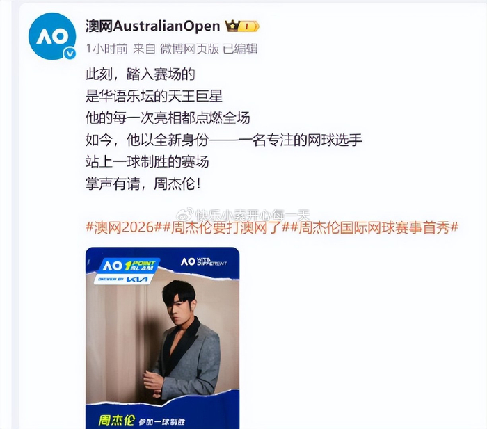 澳网官方:此刻,踏入赛场的是华语乐坛的天王巨星,他的每一次亮相都点燃全场。如今,他以全新的身份 一名专注的网球选手,站上一球制胜的赛场,掌声有请,周杰伦。