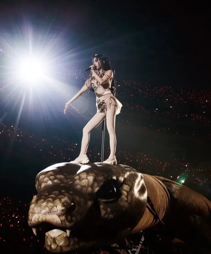 之所以会出现开场统领舞台的“巨蟒”,是因为2025年是生肖蛇年。蔡依林团队宣称这样设计,是在生肖蛇年的背景下,将中国神话中女娲灵蛇的意象,与蔡依林金曲《美杜莎》的故事精妙融合,以灵动的蟒身承载着华夏传说里的神秘气韵,实现了中西神话在当代舞台上的对话。