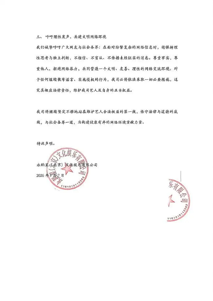 此外,声明呼吁广大网友与社会各界,请保持理性思考与独立判断,不轻信、不盲从、不传播未经证实的消息。