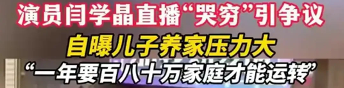 此前,闫学晶因在直播中称儿子“拍一部戏就挣几十万”却要负担“家庭年开支百八十万”,并发表“现在哪有穷人?你受穷就是你懒”等言论,遭全网抨击其“炫富式哭穷”“何不食肉糜”。