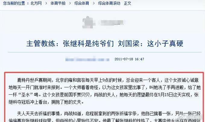 在2011年,张继科与她的丈夫联手争夺冠军,她常常在清晨时分前往雍和宫为他们祈求好运,并将收到的祝福纸条交给他们随身携带。