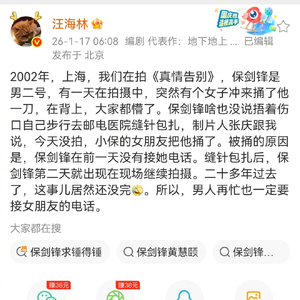 【#汪海林称黄慧颐曾剧组刺伤保剑锋#】#保剑锋黄慧颐纠纷时间线梳理#1月17日,编剧汪海林在个人社交平台发文称,2002年拍摄《真情告别》期间,演员保剑锋被当时女友黄慧颐刺伤背部,两人二十余年情感纠纷再引热议。