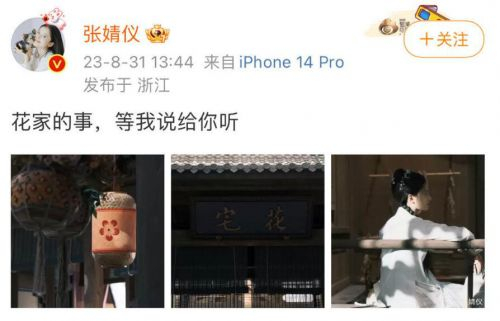 张婧仪发布三张片场照并配文:花家的事,等我说给你听