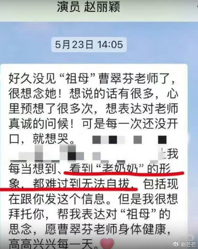而且,有人扒出这么一张图片,是赵丽颖问候《知否》祖母扮演者曹翠芬老师,除了对老人的问候,祝福,言语当中,有些酸涩。