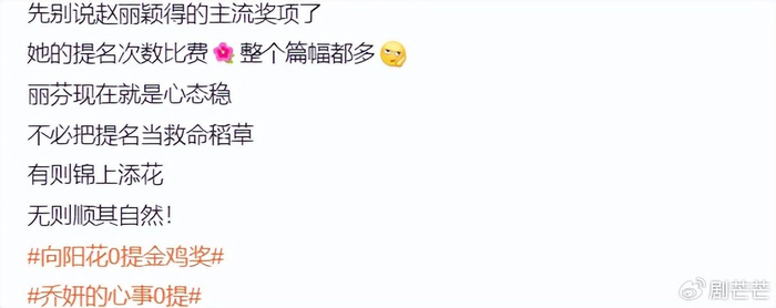 而同款再度上演,即使演技在线,也多少无惊无喜了点。所以,冯小刚这个大导演镇场子,赵丽颖挑大梁的《向阳花》,最终金鸡奖零提名,其实合情合理。