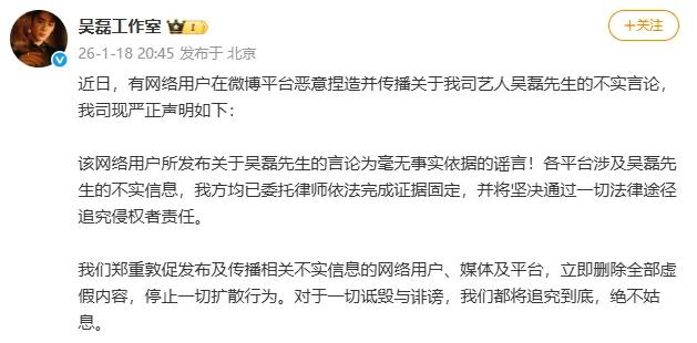 1月19日,演员吴磊通过个人微博账号@吴磊LEO 回应:“不认识,已委托律师依法追责。”随后,吴磊工作室转评:“吴磊先生与该博主素不相识,无任何交集!也感谢所有关心及为吴磊先生发声的朋友,对于此类卑劣行径,我方会积极应对,必将依法维权到底!我们相信时间会证明真心,但也会手持利刃,让真诚有力可言!”