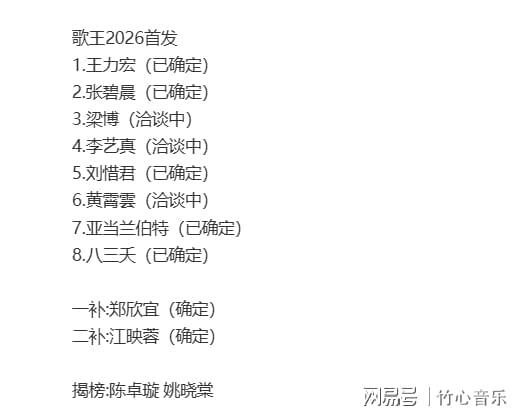 好消息来了,《歌手2026》会如期举办。而且,《歌手2026》年的首发歌手名单已被曝光,有的已确定参加,有的则在协商洽谈中。