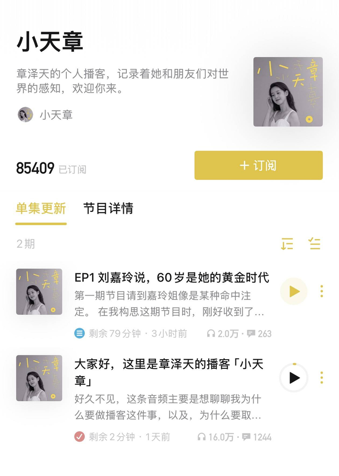 1月12日,章泽天个人播客“小天章”在小宇宙、小红书平台上线,目前仅发布2期内容,全平台粉丝/订阅数已涨超20万。
