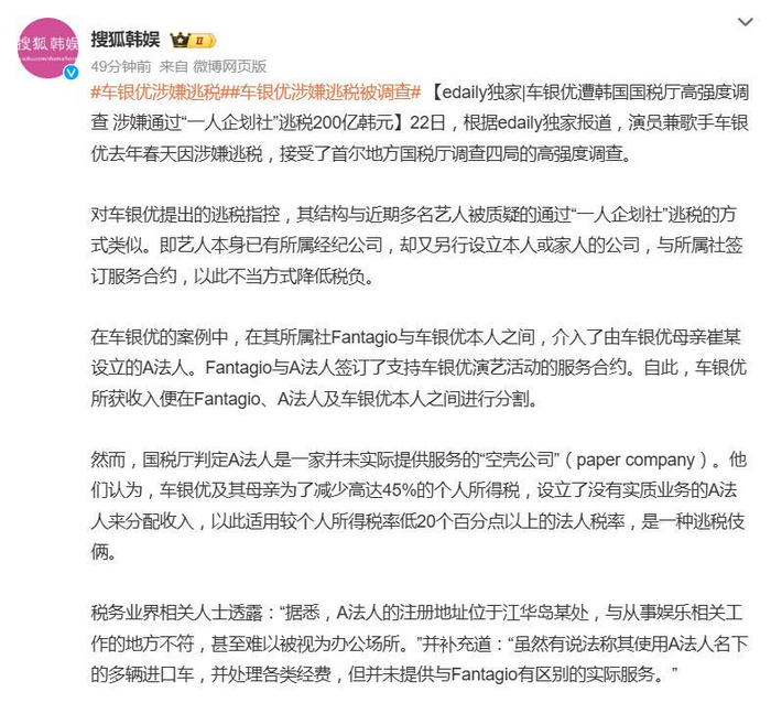 调查结果更是给了这套说辞一记重锤。国税厅发现,这家A法人既无实际办公场所,也无提供服务的人员,根本未对车银优的演艺活动提供任何区别于Fantagio的实质性服务。其唯一功能,似乎就是“分散收入”。因此,车银优个人被认定需追缴超过200亿韩元的个人所得税。连他的经纪公司Fantagio也因处理与A法人相关的虚假税务发票,被追缴了82亿韩元的增值税,且申诉已被驳回。