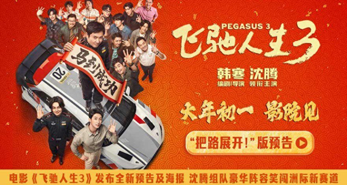 电影《飞驰人生》系列前两部均在春节档给观众带来热血逐梦的赛场故事和笑中有泪的情感共鸣。此次,第三部依旧是熟悉的配方,更有着实力阵容、新赛道极限挑战和工业化制作水准等维度的全面升级。无论是新老朋友齐聚的“飞驰天团”与合家欢的类型风格,还是高能刺激的赛车场面与辞旧迎新开启人生新篇章的美好寓意,均昭示着《飞驰人生3》将是一道笑点、泪点、燃点兼备的“春节硬菜”。同期发布的“马到成功”版海报以炽热鲜红为主色调,飞扬的金色彩带点缀其间,“飞驰天团”全阵容欢乐集结,新春的热闹与喜气扑面而来。沈腾饰演的张驰身穿黑色赛车服身姿挺拔地站在赛车顶,展开写有“马到成功”的条幅,既饱含对新征途的美好期许,亦传递出对新一年的祝福。在他的身边,众人共同比出“OK”手势,巧妙呼应“第三部”全员归来,并寄寓“新年一切OK”。其中,尹正、黄景瑜、张本煜、魏翔、范丞丞、孙艺洲、胡先煦、贾冰等系列IP原班人马回归,人物关系将迎来怎样的延续与变化?沙溢、段奕宏、张新成、李治廷、王安宇、陈永胜等新朋友又将在新故事中承担怎样的角色?“飞驰天团”蓄势待发,迎接全新赛道的挑战。马年春节走进影院,全家一起欢乐飞驰!